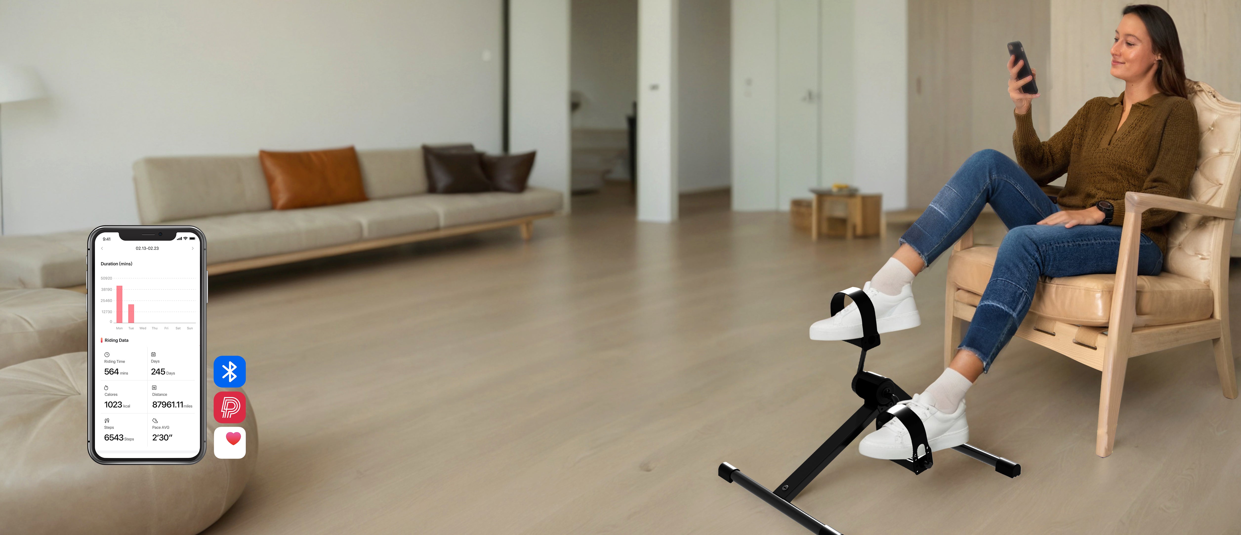 Funzione intelligente con PitPat-App si collega alla nostra bicicletta intelligente sotto scrivania per corse online, ricompense, monitoraggio dei dati e una comunità ciclistica dinamica.